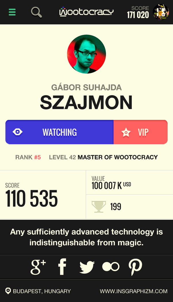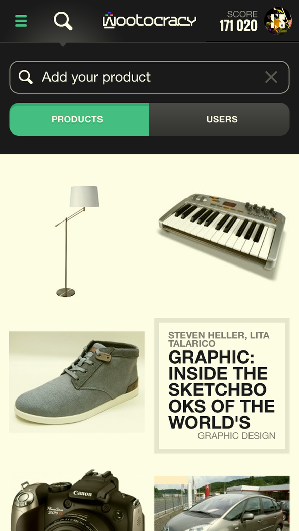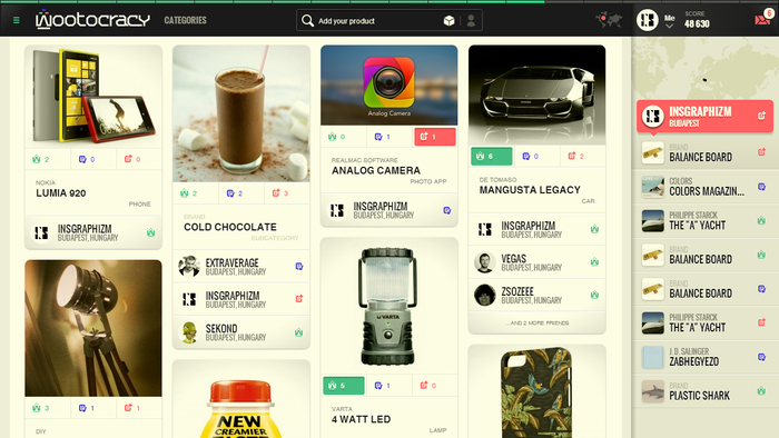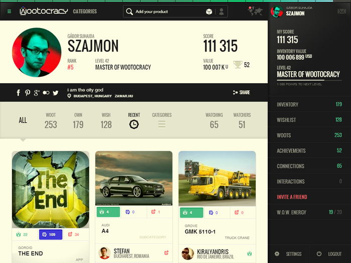 It's time to play life! Wootocracy is a platform for playing with your beloved products & brands. Seek up, list, collect, track, share and showcase all the products you own. It's your digital inventory, every stuff you own and wish, linked with pretty much everything out there. Search Wootocracy's search engine is a superb searching machine powered by partly Google and partly by our servers. You can find everything you've ever had, or you ever wished for, even if you only know the category! Play and collect cards Are you collecting baseball, basketball or telephone cards? No way! Collect "wootocracy" cards! Cards are the basic elements of Wootocracy. On them you will see a bunch of basic info about all the products you own, wish, or woot. Product and brand pages Use it for finding the products you want to buy, watch videos, read comments, reviews from the people already possessing it. You want some new Nike stuff? Check out the brand page of Nike and see what others are think about their stuff! Watch and be watched Your friends are here, too! Wootocracy is full of friendly Wootocrats to whom you can compare your inventory. Play and just be better than the others! What do you think, does your neighbor have a better smartphone than you? Show your cards Your profile is the perfect place to show the world who you are. Browse all your stuff here, send it to your friends to show them all the cool things you have. Organize your stuff You spot something that is just not okay? All the things on Wootocracy are belonging to you, organize it, as it's your very own digital inventory for everything you have. Quest and achievements Collecting things is not only about owning them, but to play with them. You receive points and badges for each and every move you make on Wootocracy. Show the world that you are a really big fan of a brand or a product category, or you simply the best among your friends. W.O.W Energy In the beginning, you have 10 units of energy, what you consume with every woot, own and wish. But don't be afraid, you gain new energy bars in every 5 minutes! As you becoming a more and more experienced wootocrat, we will expand your energy bar!