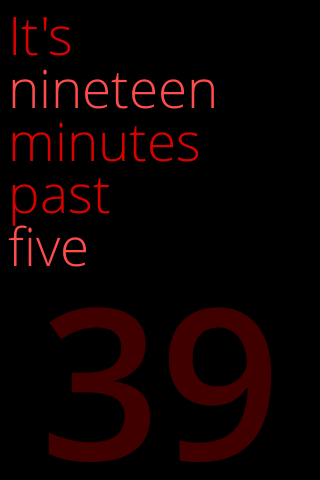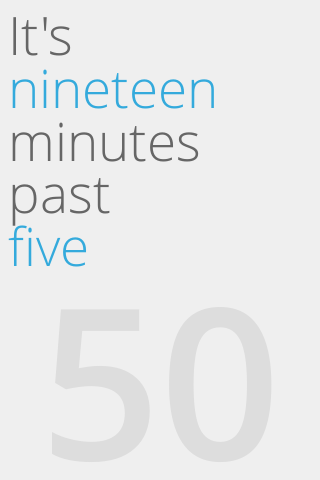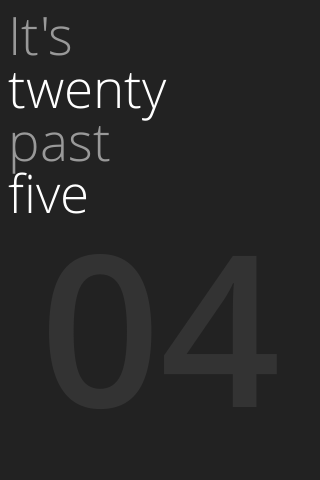 Displays the current time in a grammatical. Swipe touch to exchange of theme. Three themes for choose: light,dark and night Showing more of my apps, some very utililes http://firefoxosapps.webserveis.com/tag/webserveis/