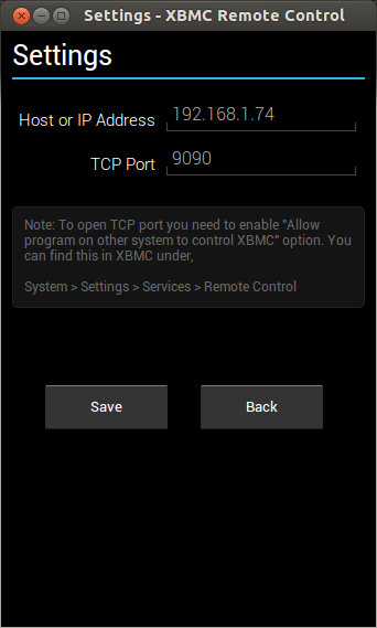 XBMC Remote Control (Frodo) Remote Connects using TCP port (default 9090). Will work only with Frodo and above. You have to enable "Allow program on other system to control XBMC" option. You can find this under, System > Settings > Services > Remote Control Note: This extension makes use of TCP port, do not confuse it with HTTP PORT. By default TCP port is 9090 if you haven't changed it leave it to default in settings. Note: If you are wondering why there is no username and password options, this extension connects using websocket over TCP port. Even if your XBMC has username and password confirgured don't worry about it, it will still connect. Cheers!