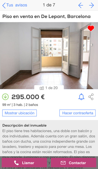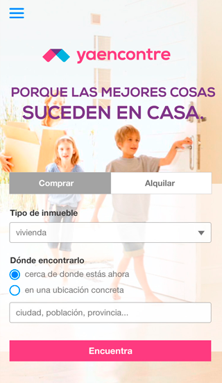 Encuentra entre más de 800.000 inmuebles en venta y alquiler, según tus necesidades: pisos, casas, apartamentos, locales y mucho más. Con la nueva App de yaencontre.com, podrás encontrar lo que buscas de la manera más sencilla y rápida, estés donde estés. App de yancontre.com: pisos en venta y alquiler en tu móvil La nueva App de yaencontre.com te permite encontrar rápidamente pisos de compra y alquiler, y todo tipo de viviendas en Barcelona, Madrid, Valencia, Bilbao y otras ciudades, así como oficinas, locales, naves, parkings y otros inmuebles. El uso de la aplicación de yaencontre.com es muy fácil e intuitivo. Está pensada para que puedas hacer rápidamente lo que te interesa cuando entras en un portal inmobiliario: encontrar el inmueble que buscas. Ni más ni menos. Entre otras cosas, con esta aplicación puedes: