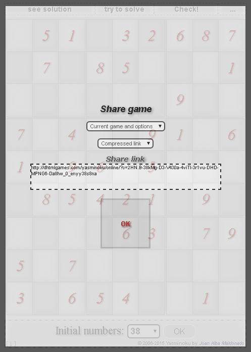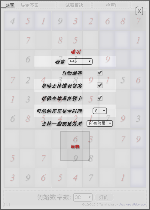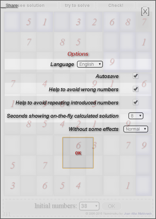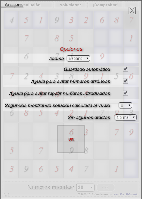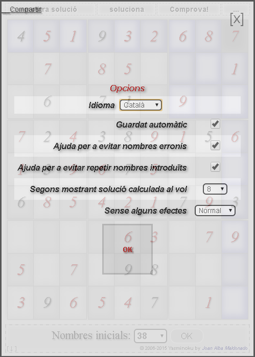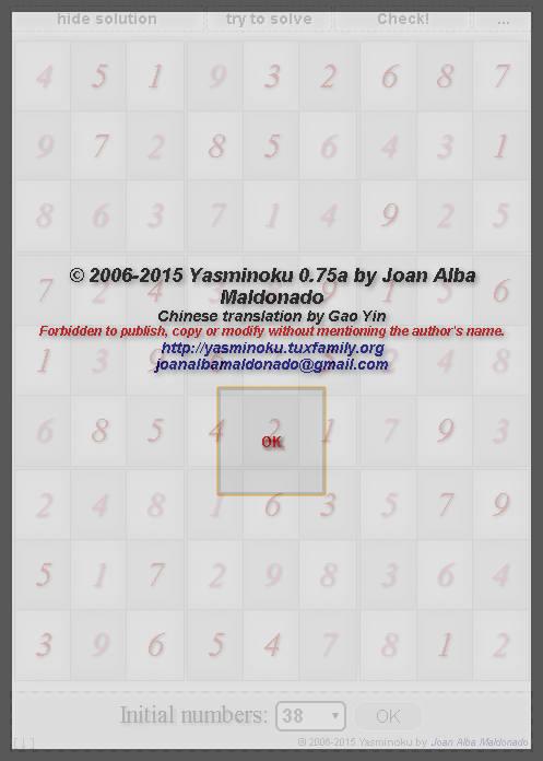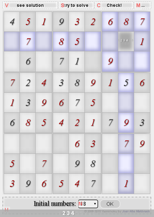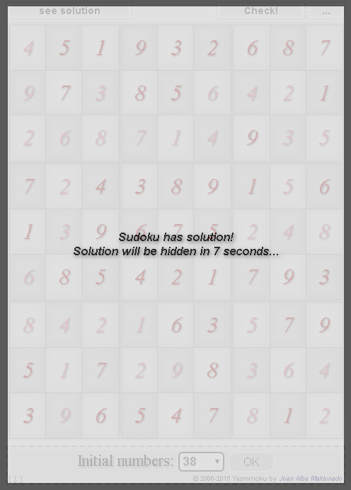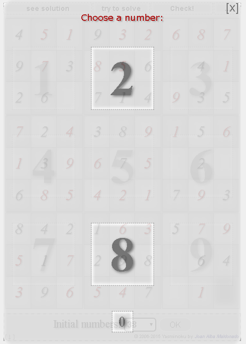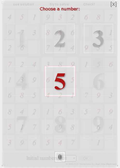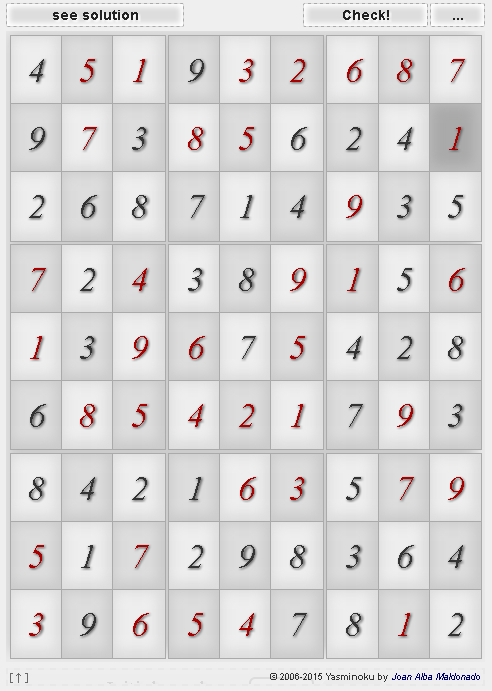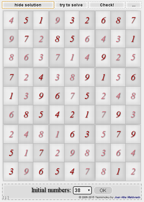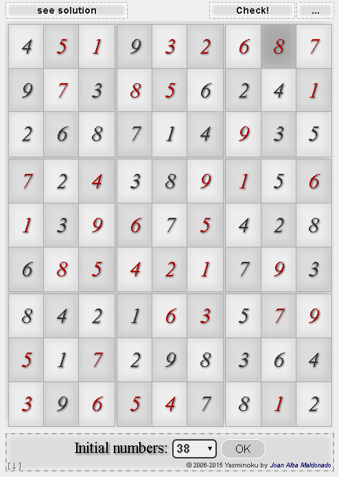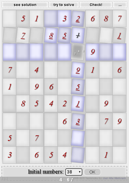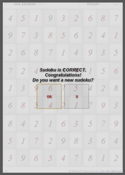 Yasminoku is a sudoku game, generator and solver created by Joan Alba Maldonado on 25th of July 2006 which has been now improved.