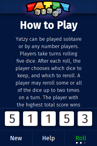 Yatzy can be played solitaire or by any number players. Players take turns rolling five dice. After each roll, the player chooses which dice to keep, and which to reroll. A player may reroll some or all of the dice up to two times on a turn. The player with the highest total score wins the game. After each round (3 rolls / round) points must be entered into a table.