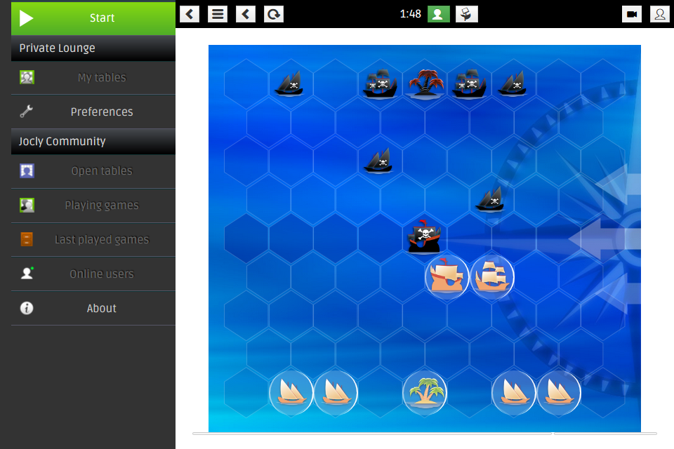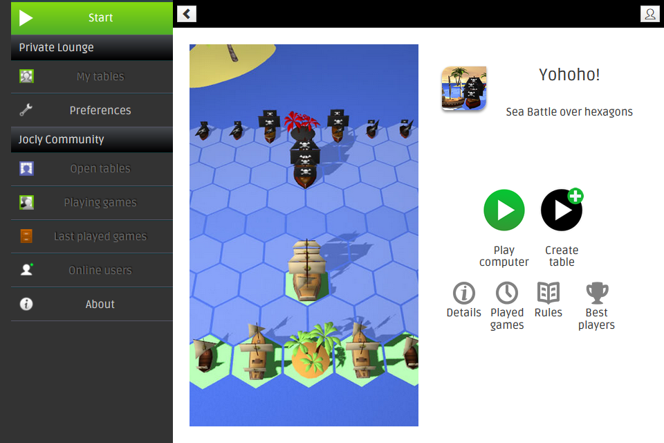 Sea battle over hexagons Yohoho! is a two players strategy game without any random. It is played on a board made of hexagons and simulate a sea battle. The game can be compared to Chess in a number of aspects.