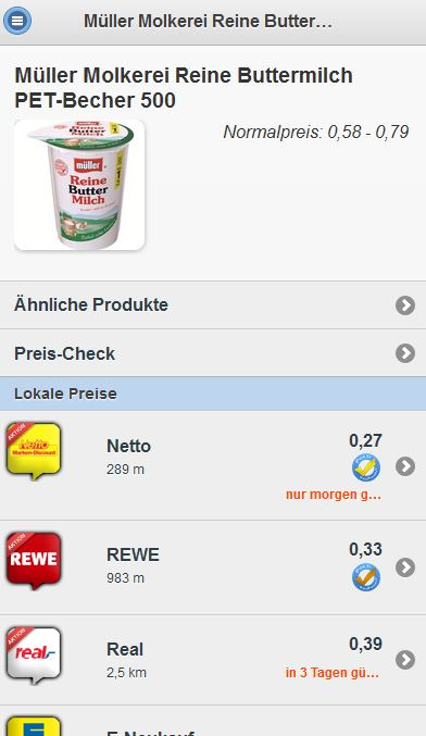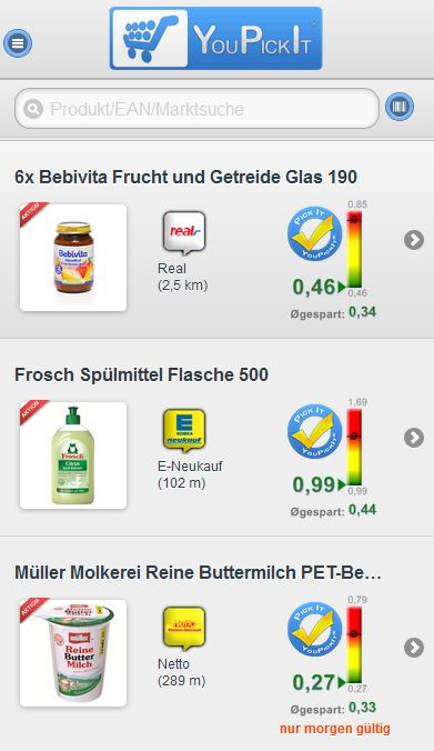Mit YouPickIt weißt Du genau, was Du wo und wann am günstigsten einkaufen kannst - an jedem deutschen Standort. Du erstellst Deine Einkaufsliste und kannst Deinen Einkauf individuell planen. Die App zeigt Dir bundesweit, welches Produkt Du wo in Deiner Umgebung einkaufen musst, um dein Sparpotenzial bestmöglich zu nutzen. Täglich werden rund 60 Millionen Preise zu ca. 600.000 Produkten des stationären Handels dargestellt und per Thermometer nach Preiswürdigkeit bewertet. Die besonders günstigen Preise sind mit Gold-, Silber- und BronzePicks gekennzeichnet. Preise per Hand vergleichen war gestern! YouPickIt sagt Dir, welche Aktionen sich lohnen und welche nur günstig scheinen. YouPickIt bietet Dir die Vorteile anderer Shopping-Apps und noch mehr. Hier ein Überblick über die Funktionen der Einkaufsoptimierer-App: - Beliebigen deutschen Standort auswählen und alle Prospekte und Angebote der Märkte Deiner Umgebung bequem über das Smartphone abrufen - Sei auch an fremden Orten über Händler und Angebote informiert – die Kartenfunktion zeigt Dir alle Märkte der Umgebung auf einen Blick und leitet Dich direkt zu den Angeboten der Händler. - Scanne Produkte mit dem Barcodescanner und lege sie ohne lange Suche direkt auf die Einkaufsliste. - Führe mit dem Scanner einen Preis-Check direkt im Laden durch. Gebe einen Preis ein und das Thermometer zeigt wie günstig er ist. Solltest Du ein Produkt mit dem Scanner nicht finden, nutze die Mailfunktion und schicke uns ein Foto. Wir kümmern uns darum. - Hinterlege Produkt- und Marktfavoriten in Deinem Profil, damit YouPickIt sie für Dich in Prospekten und Suchergebnissen kennzeichnen kann. - Das intelligente Prospekt zeigt die besten Angebote und Deine Favoriten auf einen Blick. - Der PickAlarm informiert Dich über neue Aktionen zu Deinen Favoriten per Mail. - Das Herzstück: Mit der Einkaufsoptimierer-Funktion zahlst Du nie wieder zu viel! Du willst wissen was, wo, wie viel kostet? Einfach die Einkaufsliste mit Produkten füllen und festlegen, wie optimiert werden soll: nur die günstigsten Preise, nur in Favoritenmärkten oder alles im günstigsten Markt kaufen? Mit einem Klick sagt Dir die App genau, welche Produkte Du in welchem Laden kaufen musst, um am meisten zu sparen. Lade Dir die App auf Dein Android-Gerät und werde auch Du zum PickBlicker! Zu folgenden Märkten findest du Preise bei YouPickIt: - Discounter (Aldi, Lidl, Netto, Penny, Norma, Treff 3000, Netto Stavenhagen, …) - Supermärkte (Real, Globus, Kaufland, Edeka, Marktkauf, Herkules, Nah + Gut, Ratio, Hit, Rewe, Toom, Nahkauf, Tegut, Kaisers, …) - Bio (Alnatura, Denns, Bio Markt, Basic, Vitalia …) - Getränke (Toom, Netto, Edeka, Getränkeabholmärkte, …) - Großverbraucher (Metro, Schaper, Fegro, Ratio, Mios, SB-Union, Frey Kissel, Hamberger, Handelshof, SB-Zentralmarkt, Eurocash, Wasgau, …) - Drogerie und Parfümerie (Rossmann, Müller, DM, Ihr Platz, Budni, Douglas, …) - Tchibo - Tierfachhandel (Das Futterhaus, Fressnapf, Kölle Zoo, Tiergarten, Zoo+Co, …) - Elektronik (Media Markt, Saturn, Expert, Elektronic Partner, Medi Max, Euronics, Alpha Tecc, Pro Markt, Vobis, …) - Bau + Garten (Bauhaus, BauSpezi, Dehner, B1, Bauklotz, Globus, Toom, Obi, Hagebau, Hornbach, Praktiker, Max Bahr, Baywa, Hela, Hellweg, …) - Kaufhäuser (Galeria Kaufhof, Karstadt, Woolworth, …) - Sonderposten (Tedi, Thomas Philipps, Pfennigpfeiffer, Zimmermann, MäcGeiz, Hafu, Jawoll, …) - Spielwaren (Toys-R-Us, Rofu, Vedes, Baby One, …) - Mobilfunk (E-Plus, Mobilcom, O2, Talkline, Telekom, The Phonehouse, Vodafone, …) - viele weitere … Zusätzlich werden folgende Prospekte zum Blättern angeboten: - Einrichtung (Dänisches Bettenlager, Depot, Poco, Porta, Roller, Sconto, Segmüller, Ikea, Tejo, Möbel AS, …) - Bekleidung (Deichmann, Takko, NKD, Intersport, Kik, Ernstings Family, …) You pick it - Mit YouPickIt! Online findet ihr uns auf www.youpickit.de Hast Du Anregungen oder Fragen? Schreib uns: [email protected] Dein YouPickIt-Team