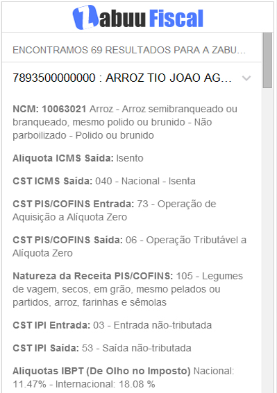 O Zabuu Carioca é um aplicativo voltado para auxiliar você na classificação fiscal dos mais diversos produtos no estado do Rio de Janeiro, o aplicativo trás as tributações de nível nacional como NCM, PIS, COFINS, IPI, CST PIS e COFINS, NATUREZA DE OPERAÇÃO PIS e COFINS além das tributações de ICMS para o Estado do Rio de Janeiro. Baseado na classificação por palavras chaves você faz a busca por Código EAN ou Palavras Chaves e o aplicativo lhe retorna os Produtos que se encaixam na sua busca, incluindo além do de todas as classificações já mencionadas as alíquotas do IBPT Nacional e Internacional.