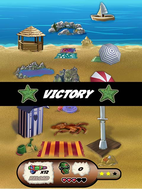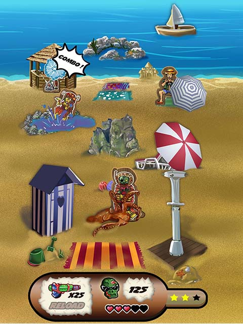 Welcome into your own B movie! You thought you could take it easy at the beach under the sun of the summer? Sorry but you can forget it because famished zombies are invading the place, determined to raid the free buffet that are the multiple tourists who are at the beach too. Since we’re in a very bad movie, you are obviously armed. Use your shotgun to clean the beach and save all the pretty ladies (you might get lucky). Zombies at the Beach is a first person shooter in which you must manage your stock of ammunition and kill the enemies that are hiding behind the elements of the decor. Shoot them down as fast as you can: if they come to close to you, they are going to attack you! Take caution because there are also is some civilians that you must absolutely not shoot! Even if they’re as pale as the dead! Eliminate always more zombies through a hundred of level while take care of avoiding their mortal attacks. Put your reflexes and your speed to the trial and make the putrefied flesh of those morons fly to survive and become worthy of the worst B movie ever put to film. CARACTERISTICS -100 levels -300 stars to collect -Best score
