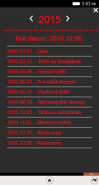 Nem kell többet keresgélned, hogy mikor lesz legközelebb munkaszüneti nap. Ezzel az alkalmazással egy pillanat alatt megtalálod bármely évben, hogy milyen napra esnek és hány nap múlva vagy éppen hány napja voltak a pirosbetűs napok.
