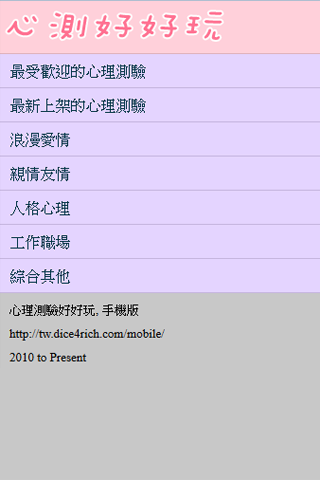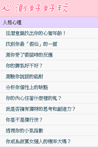各式各樣小小有趣的心理測驗,幫助你更了解自己喔。 透過不同種類的心理小測驗,幫助您透視自己內在的愛情觀、友情狀況、隱藏的想法、以及工作職場的發展等等。